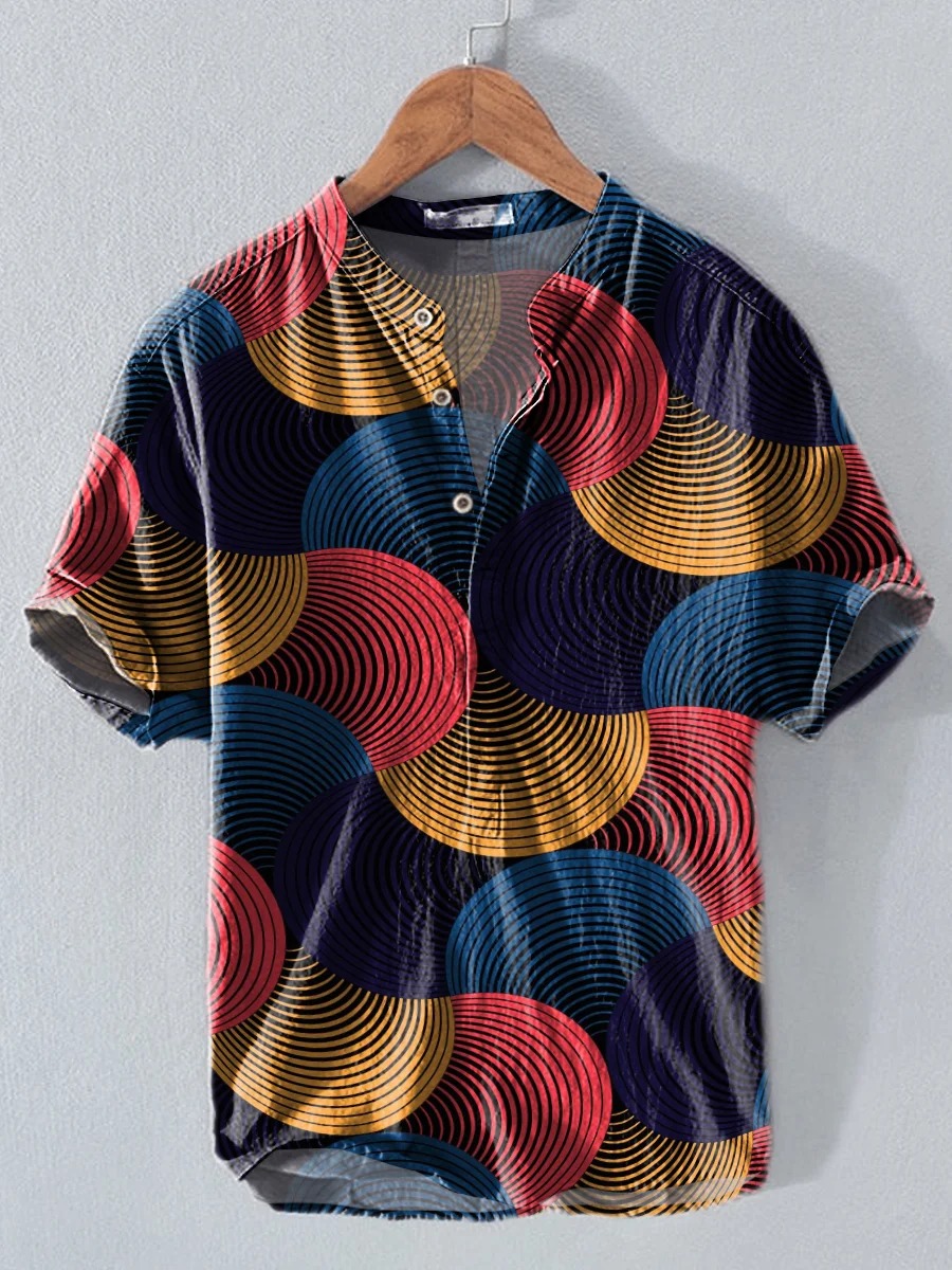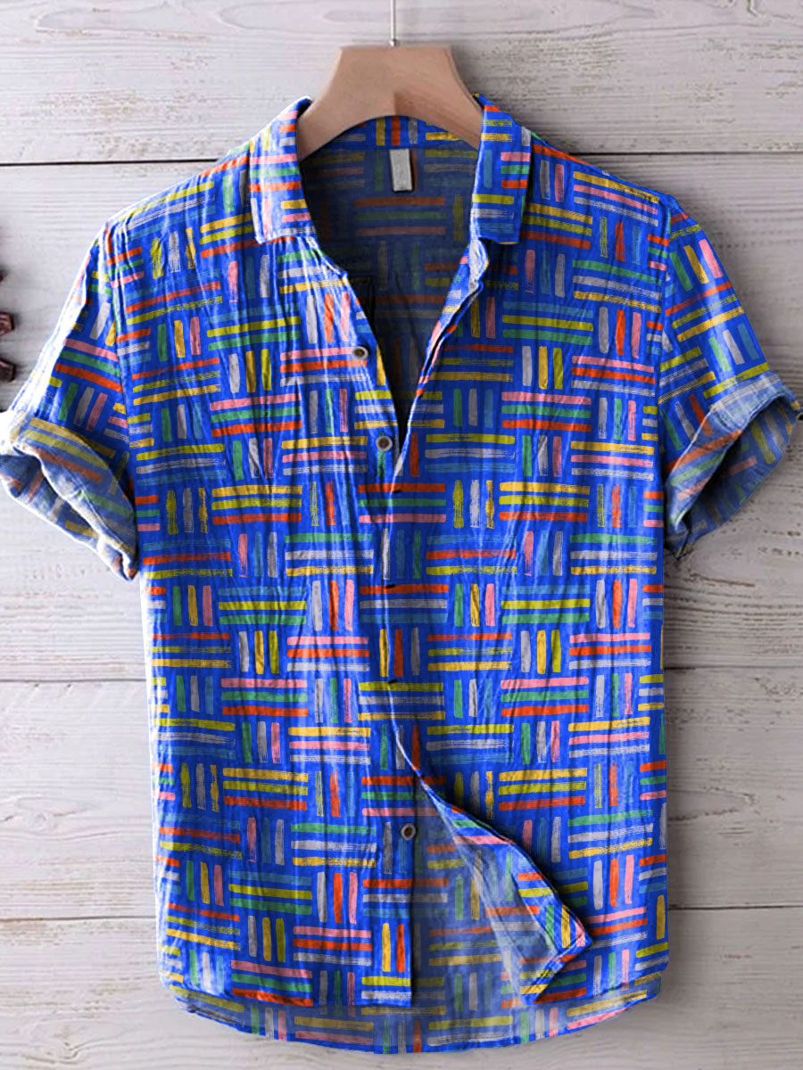 Colorful Geometric Short Lines Arrangement Decorative Pattern Casual Cotton And Linen Shirt